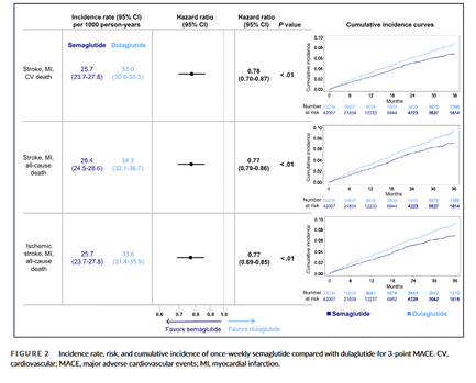 Tan X, Liang Y, Xie L, Harton J, Gutierrez C, Muhammad C, Swift C, de Havenon A. Comparison of cardiovascular outcomes between once-weekly semaglutide and dulaglutide in adults with type 2 diabetes and established atherosclerotic cardiovascular disease in the United States. Diabetes Obes Metab. 2026 Jan 8. doi: 10.1111/dom.70440. Epub ahead of print. PMID: 41508706.