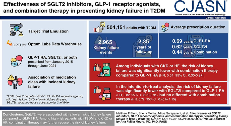 Blum MF, Mehta S, Surapaneni A, et al. A Target Trial Emulation Study of SGLT2 Inhibitors, GLP-1 Receptor Agonists, and Combination Therapy in Preventing Kidney Failure in Type 2 Diabetes. Clin J Am Soc Nephrol. Published online November 20, 2025. doi:10.2215/CJN.0000000902